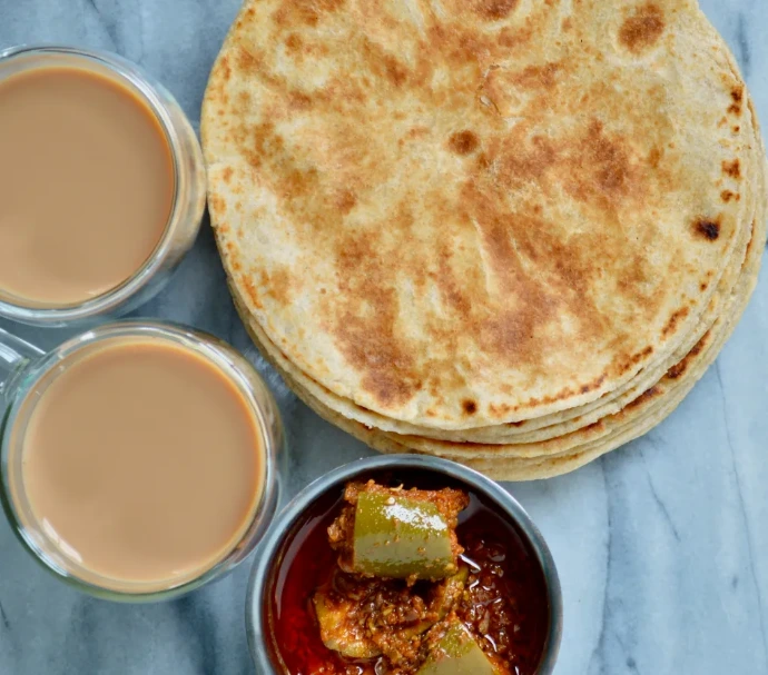 Kothmir Marcha Bhakhri is a crunchy traditional snack made from whole wheat flour, fresh coriander, and a hint of chili, offering a zesty, aromatic flavor. Rich in fiber, it aids digestion, supports gut health, and provides wholesome, long-lasting energy with a vibrant, classic desi taste.
