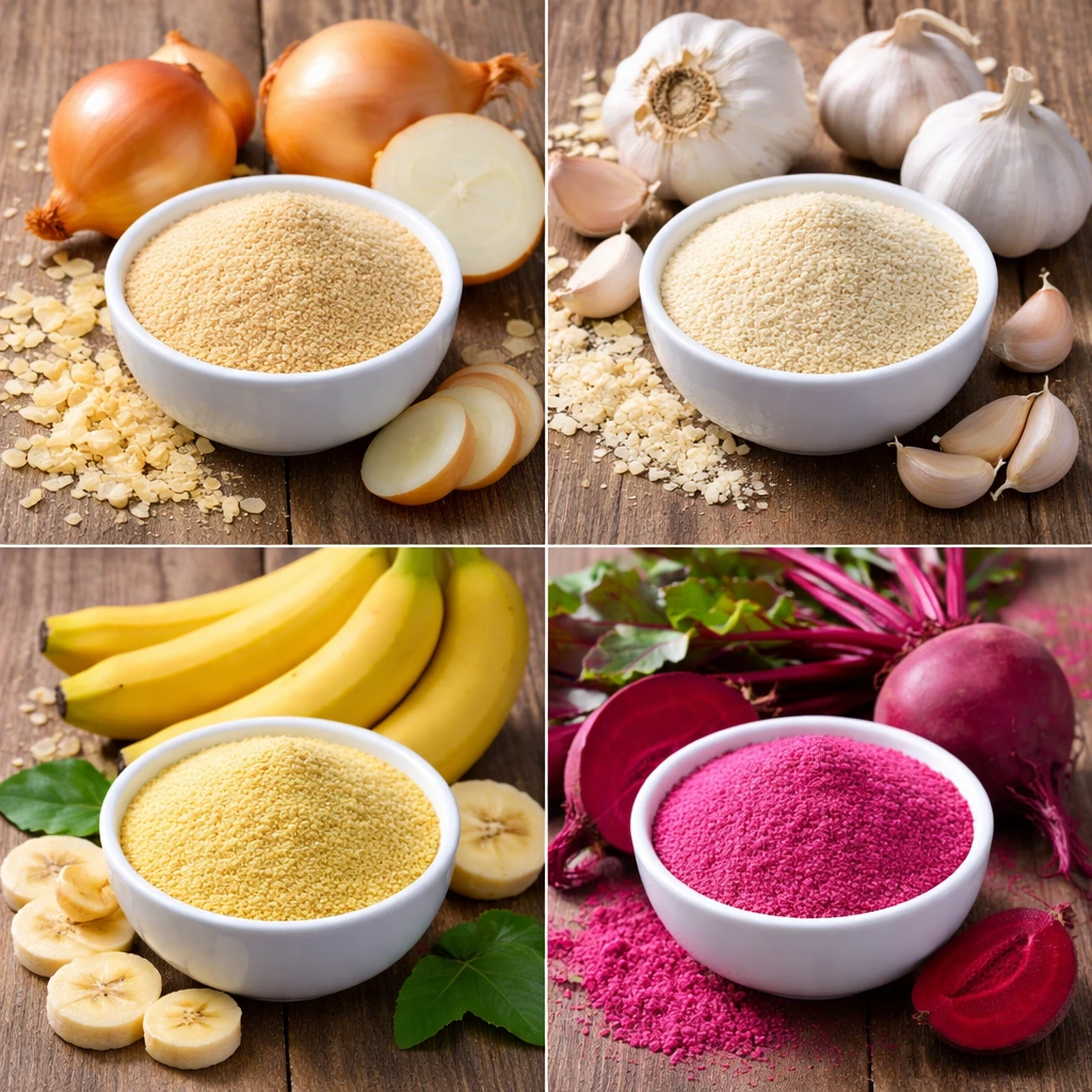 "High-quality dehydrated powders of onion, garlic, banana, and beetroot. Retaining natural flavor, color, and nutrients, perfect for cooking, smoothies, and healthy recipes."